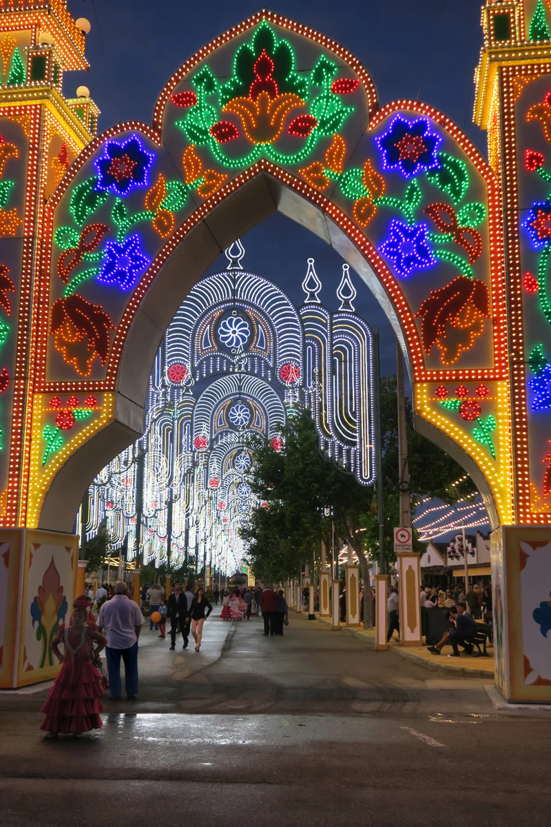 It so happened that we visited during Feria, or Spring Festival—a carnival for the changing of seasons. Feria is a big deal. It is where local women wear traditional Spanish dresses and twirl their bodies before spectators of families who eat fried chicken and paella and clink glasses of blood-red Sangria inside rows of themed tents. Young children chase each other while older ones try to win prizes by knocking over bottles with BB guns. Above their heads: millions of colored lights are strung between massive yellow archways, which themselves were studded with brilliant multicolored bulbs that made the sunset look like it’d been sprinkled with gemstones.